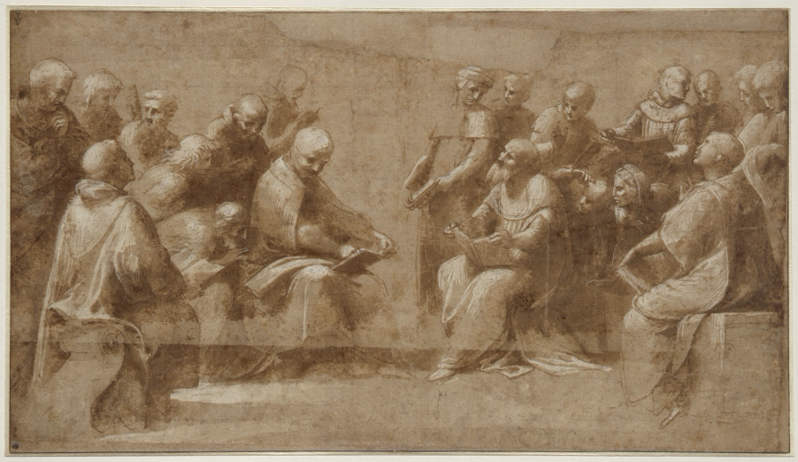 Raffaello Sanzio, dit Raphaël, Étude pour la Dispute du Saint Sacrement : vingt clercs et ecclésiastiques discutant, plume et encre brune, lavis brun, rehauts de blanc, mise au carreau à la pierre noire, sur papier brun, traits d’encadrement à la plume et encre brune, H. 0,231 m, L. 0,405 m, Musée Condé, Chantilly.
