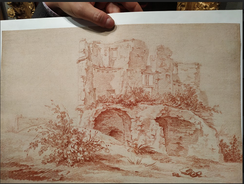 À gauche : Jean-Baptiste Marie Pierre, Ruines, v. 1750, sanguine, Galerie Terrades.